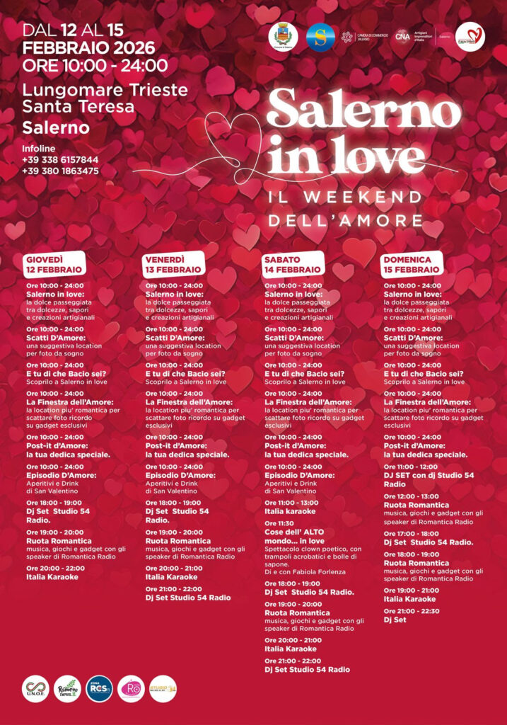 Torna Salerno in Love con la sua seconda edizione, un evento dedicato a San Valentino e pensato per celebrare l’amore sul suggestivo lungomare della città. Da giovedì 12 a domenica 15 febbraio, dalle 10 a mezzanotte, il Lungomare Trieste – all’altezza di Santa Teresa – ospiterà eventi, musica, installazioni, iniziative speciali e un mercatino ricco di artigianato di eccellenza.