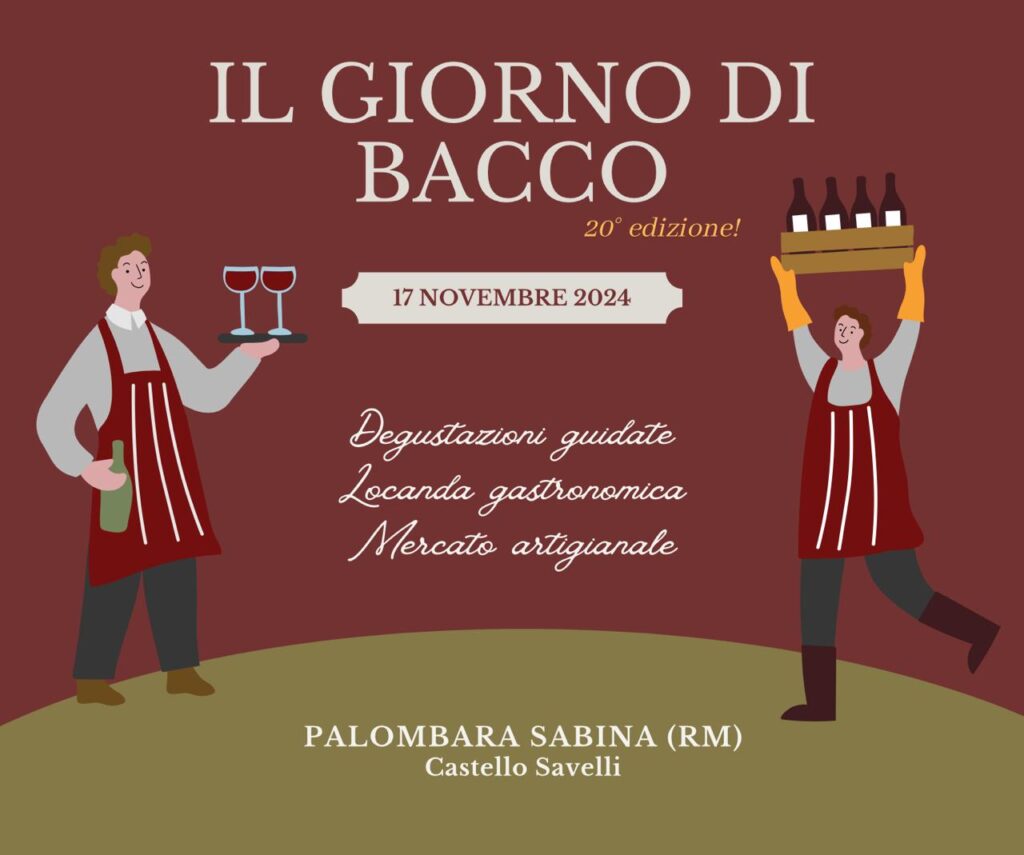 E allora saltate in macchina e raggiungeteci, a pochi chilometri tra Roma e Rieti, è lì Palombara Sabina, con il suo Giorno di Bacco, il 17 novembre, per la sua 20esima edizione.
