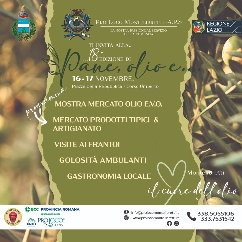 Passeggiare lungo il corso può far venire fame e un buon boccone, prima, durante e dopo, è una delle esperienze “sensoriali” che la Pro Loco di Montelibretti vuol farvi conoscere. Pane, olio e…infatti, riunisce tutte le eccellenze di qualita’ del territorio. Il cibo e l’ospitalità a tavola, lega in modo stretto le persone. L’obiettivo è costruire una grande rassegna di cultura e tradizione gastronomica, una grande festa all’insegna dei prodotti di qualità della sabina romana.