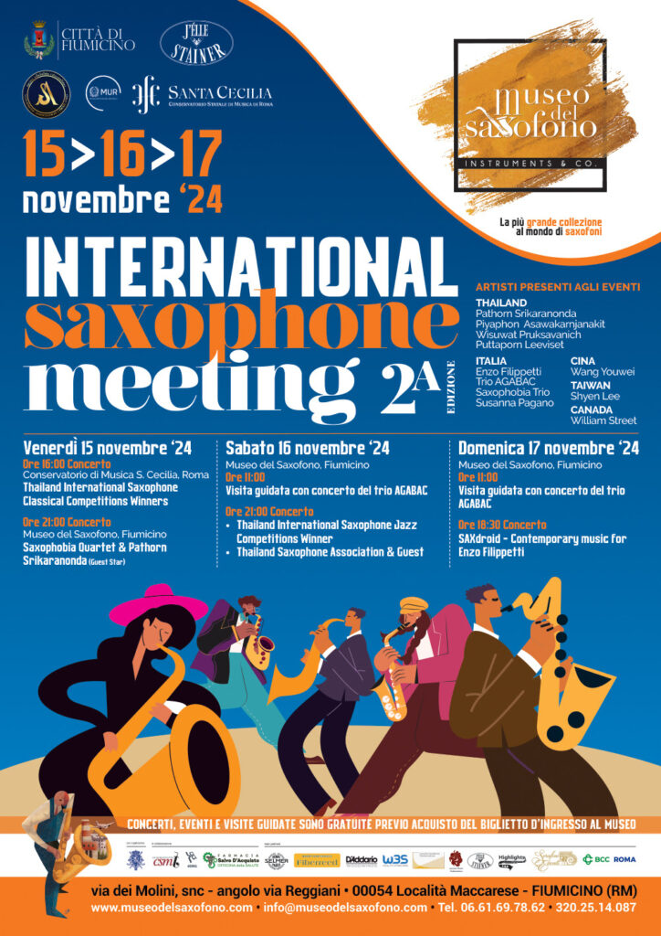 Dal 15 al 17 novembre al Museo del Saxofono di Fiumicino è in programma la 2a Edizione dell’International Saxophone Meeting 2024, un evento internazionale di divulgazione del patrimonio museale organizzato in collaborazione con la Saxophone Association Thailand (SAT), il Conservatorio di Musica S. Cecilia di Roma e la casa costruttrice brasiliana J’Elle Stainer, e che vedrà protagonisti artisti provenienti dalla Thailandia, Taiwan, Cina, Canada e Italia, tutti accomunati dalla passione per il saxofono.Tutti gli eventi, le visite guidate musicali, le masterclass e i concerti in programma sono gratuiti previo acquisto del biglietto d’ingresso al museo.