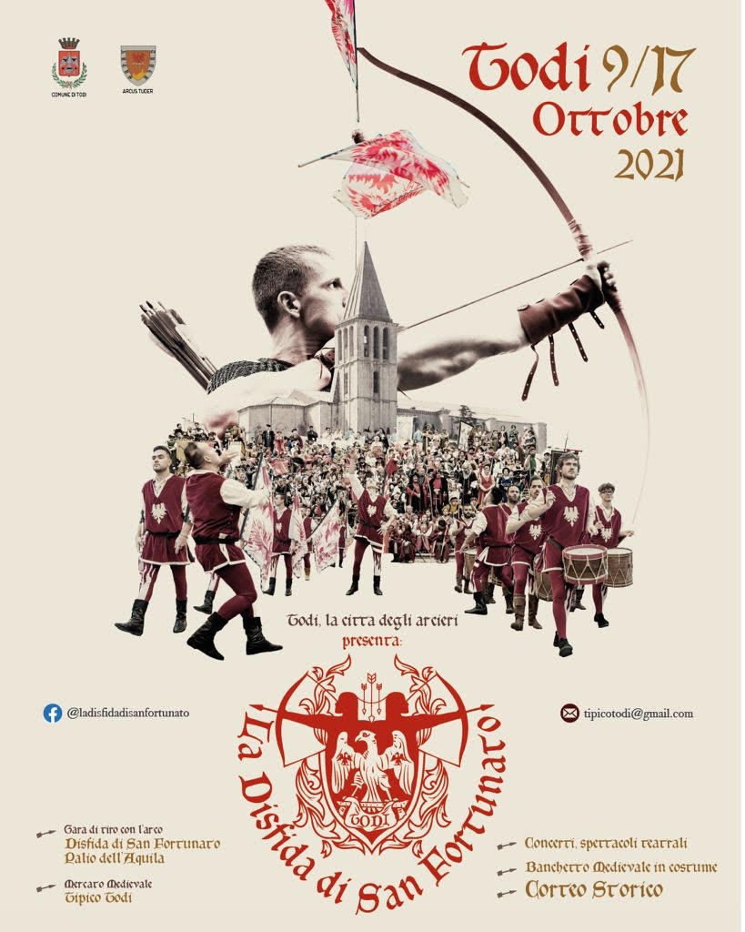 Indomiti arcieri si sfideranno nella quarta edizione del Palio dell’Aquila e nella Disfida di San Fortunato; Piazza del Popolo ospiterà l’XI edizione della Mostra Mercato Tipico di Todi. Nella Chiesa di San Fortunato si terranno il Concerto di musica Sacra Vocale e Strumentale, con i musicisti amici di Todi, e l’incontro “A tu per tu con Jacopone”, a cura del Prof. Claudio Peri. Sulla scalinata di San Fortunato avrà luogo la rappresentazione teatrale “Sublimazione Dantesca”; sotto i Voltoni comunali il concerto dell’ensemble “Orientis Partibus”, e ancora conferenze, laboratori, esibizioni di falconeria, danze medievali, combattimenti medievali e sbandieratori al suono dei Musici e Sbandieratori Arcus Tuder.