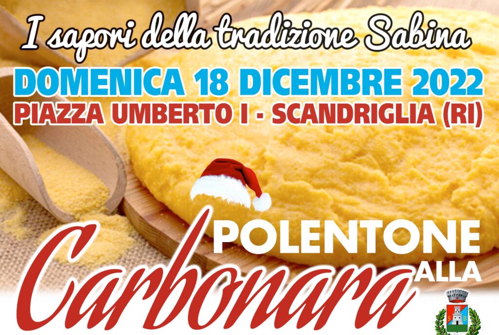 A Scandriglia un evento gastronomico con i sapori tipici della tradizione laziale. Appuntamento con il piatto tipico dei boscaioli, gli antichi carbonari. Cuoche d’eccezione le donne del posto, festa popolare con la degustazione di specialità locali cucinate secondo le antiche ricette. Il Polentone è servito con pancetta, salsiccia e vino. Prodotti tipici, olio EVO e vin brulè. Alle ore 16,30: Aspettando Babbo Natale con consegna delle letterine.