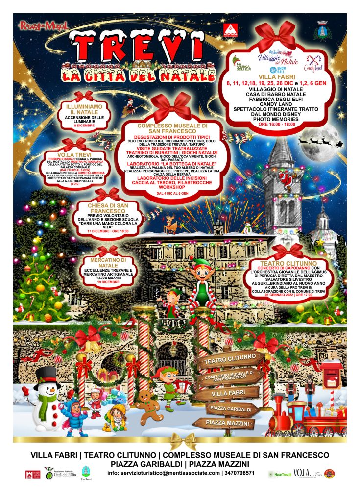 Il Comune di Trevi e Menti Associate organizzano il Natale della città con la collaborazione de I Ragazzi del Musical: quest’anno Trevi si trasformerà in una vera e propria “Città del Natale”. Tantissimi gli eventi, gli stand e gli allestimenti che vi faranno vivere la magia di questo periodo in tutte le vie del Centro Storico.