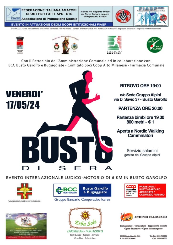 Venerdì 17 maggio torna la Busto di Sera con tre grandi novità a Busto Garolfo (MI): la corsa per i piccoli, la camminata e l’apertura a chi pratica nordic walking