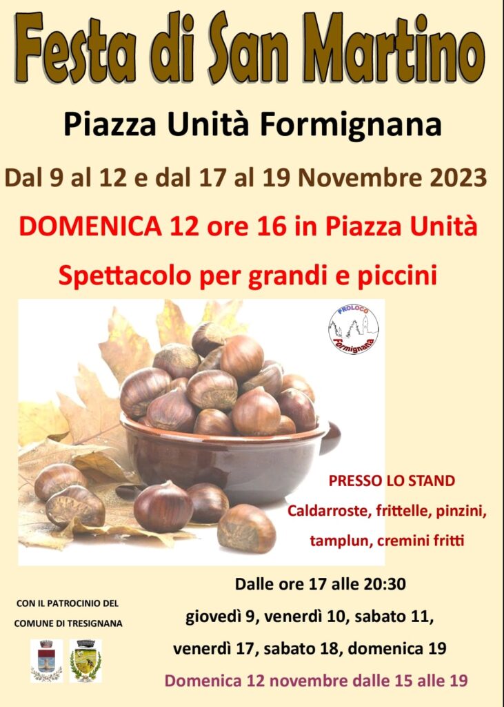 La Pro Loco vi invita alla gustosa manifestazione che si terrà in Piazza Unità con numerosi stand in cui gustare i prodotti tipici autunnali: caldarroste, frittelle, pinzini, tamplun, cremini fritti e tanto altro.