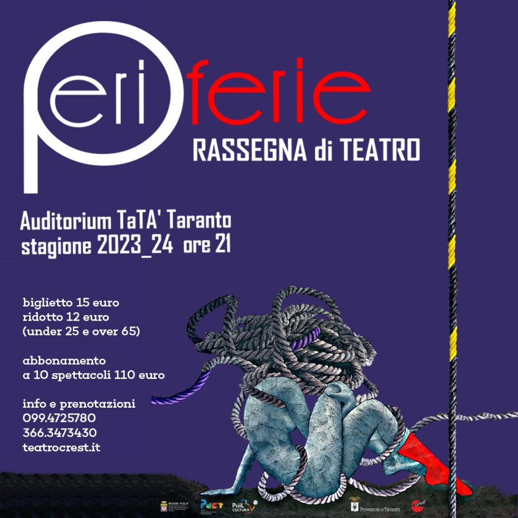 Il teatro a Taranto, libero dagli echi televisivi. In una parola, «Periferie», la Stagione del Crest all’Auditorium TaTà. Dieci titoli dal 18 novembre al 6 aprile per dieci occasioni con le quali scoprire nuovi autori, linguaggi, attori e attrici. «Tutti spettacoli per un pubblico curioso e allergico allo star system di Nostro Signore Botteghino, in una città ormai mirabolante», spiega la presidente della storica compagnia, Clara Cottino.