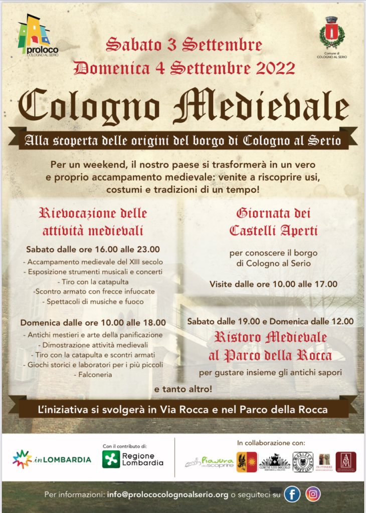 Proloco Cologno al Serio, in collaborazione con Comune di Cologno al Serio, Corvi di Ventura, Corte XIII sec. e Sagitta Imperialis, è pronta a farvi rivivere delle giornate tipo del Medioevo, dove la vita si svolgeva tutta attorno al fulcro pulsante del campo medievale. L’evento si inserisce nell’ambizioso progetto che il team di Proloco Cologno sta compiendo sul territorio per riportare alla luce le antiche tradizioni del tempo.