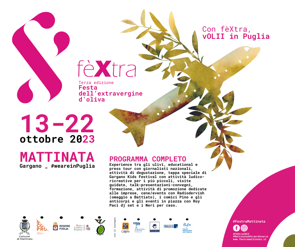 Experience tra gli ulivi, educational e press tour con giornalisti nazionali, attività di degustazione, tappa speciale di Gargano Kids Festival con attività ludico-ricreative per i più piccoli, visite guidate, talk-presentazioni-convegni, formazione, attività di promozione dedicate alle imprese, cene/evento con Radiodervish (omaggio a Battiato), i comici Pino e gli anticorpi e gli eventi in piazza con Roy Paci dj set e i Neri per caso. Tutto questo sarà la terza edizione di FèXtra, Festa dell’extravergine d’oliva.