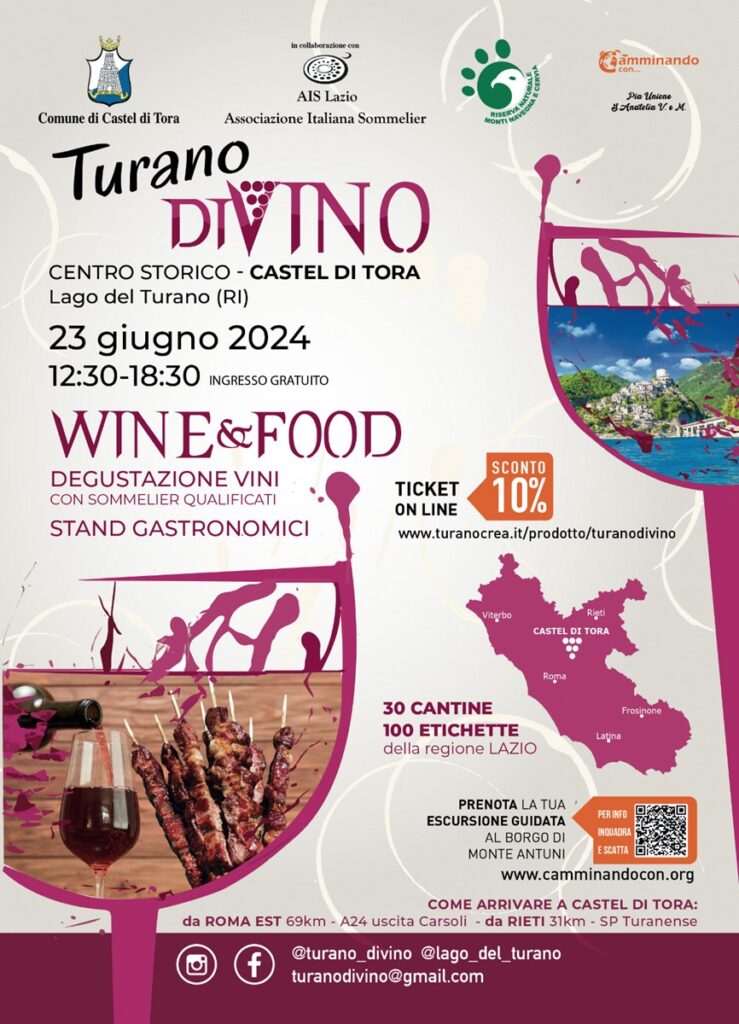 Il 23 giugno a Turano (RI) dalle 12,30 alle 18,30 si brinda con “Turano diVino”. Ogni bicchiere sarà accompagnato dalla voce esperta di un sommelier che ve lo racconterà. Che siano note di ciliegio o chissà se di pesca o albicocca, assaporatele e ascoltate”le”, sarà un viaggio sensoriale attraverso la storia e la cultura del vino. La manifestazione vuole valorizzare il territorio attraverso la degustazione di pregiati vini e la scoperta di prodotti gastronomici locali e non solo, di certo genuini. Arrosticini, patatine fritte, farro, pane cunzato, ciambelle tipiche del territorio e altro. È presente anche uno stand senza glutine.