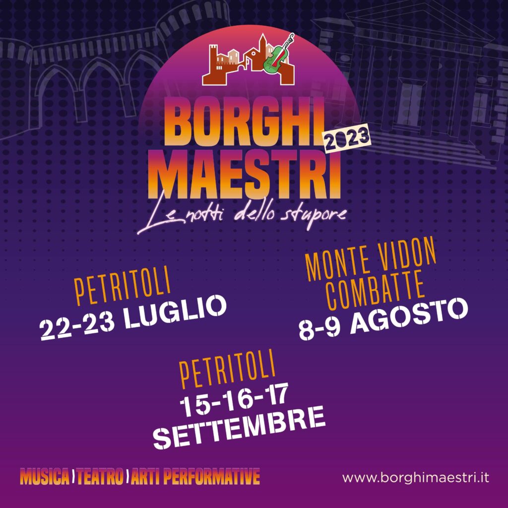Borghi Maestri è un progetto realizzato in aggregazione dai comuni di Petritoli (capofila) e Monte Vidon Combatte (aggregato). Con Borghi Maestri i due Comuni marchigiani si pongono l’obiettivo di rendere più attrattivo ed invitante il proprio territorio per dare nuova linfa vitale al suo tessuto sociale, puntando al recupero della propria identità culturale, artistica, produttiva e alla conservazione e trasmissione dei saperi, offrendo opportunità uniche per apprendere, formarsi, avviare progetti di impresa innovativi e godere di programmazioni artistiche di spettacolo dal vivo di altissima qualità.