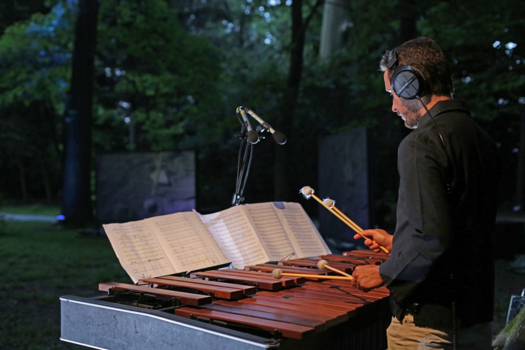 Nel minimalismo, un’idea musicale viene ripetuta all’infinito e variata, impercettibilmente, in ogni ripetizione e questo senso di costante e continuo cambiamento lega, in modo profondo, musica e natura. Mentre il pianoforte, la marimba e il toy piano, sparsi nel grande prato, creano la cadenza e l’impianto regolare e meccanico della composizione, l’elasticità delle corde degli archi, il violino, il violoncello e soprattutto la voce contrappongono un’altra pulsazione: da una parte, quindi, il tempo che si crede oggettivo e dall’altra la soggettività della presenza. Grazie a un sistema complesso di sovra incisioni e di loop e alla particolare natura del brano, che ha nella ripetizione una sua caratteristica strutturale, i 5 esecutori compongono tutte le 18 linee originarie: il pubblico può ascoltarle sia nell’atto della loro esecuzione dal vivo e senza alcuna mediazione e sia contemporaneamente nella loro registrazione e riproduzione. In cuffia è possibile ascoltare l’intera composizione o scegliere i solisti e gli strumenti arrivando a confondere il suono con i rumori della natura. Non sono disponibili sedie e il pubblico è invitato a portare un plaid da casa.