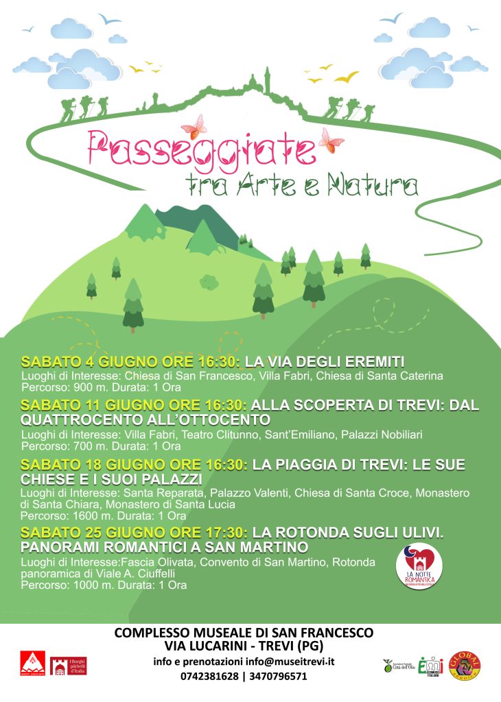 Una speciale passeggiata verrà svolta in occasione di Trevi Romantica, il 25 giugno. Si percorrerà il viale alberato di via Ciuffelli per raggiungere la rotonda che si affaccia su una delle vedute più affascinanti del borgo. Si potrà poi ammirare l’immensa bellezza del Convento di San Martino con la cappella affrescata dallo Spagna e le pitture di Andrea e Tiberio d’Assisi e del Mezzastris che adornano la chiesa.