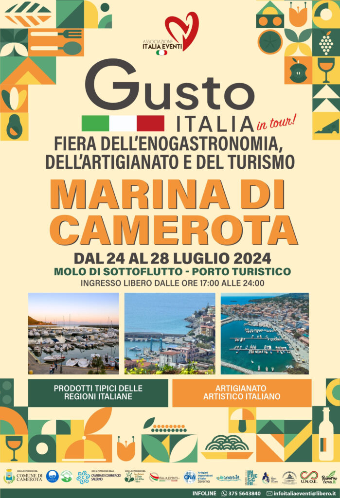 Resta nel Cilento Gusto Italia e, da mercoledì 24 a domenica 28 luglio, approderà al Porto Turistico di Marina di Camerota. In una cornice naturalistica unica, premiata sia con la Bandiera Blu per la sostenibilità, l’ambiente ed i servizi, che con la Bandiera Verde assegnata per le spiagge a misura di bambino, la fiera itinerante dell’enogastronomia, dell’artigianato e del turismo è un’occasione speciale per entrare in diretto contatto con produttori ed artigiani, per acquisti consapevoli e Made in Italy.