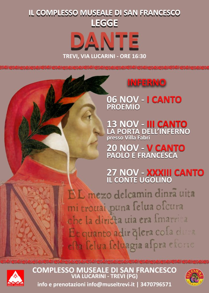 A Novembre, il Complesso Museale di San Francesco di Trevi, dedica tutti i sabato pomeriggio al Sommo Poeta. Una serie di letture, introdotte ed esposte dallo storico dell’arte Carlo Roberto Petrini, vi trasporteranno nel mondo, o meglio, nell’Inferno della Commedia.