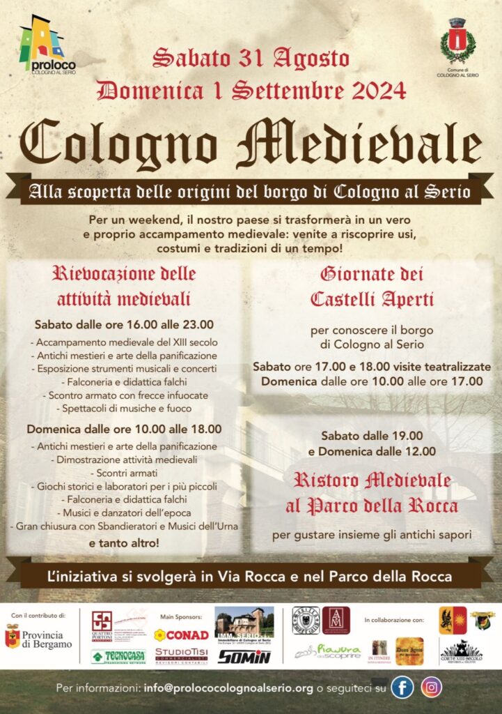 Organizzato ormai da diversi anni da Pro loco Cologno al Serio in collaborazione con il Comune e tanti artisti e gruppi storici, Cologno Medievale promette di essere un’esperienza indimenticabile per grandi e piccini.