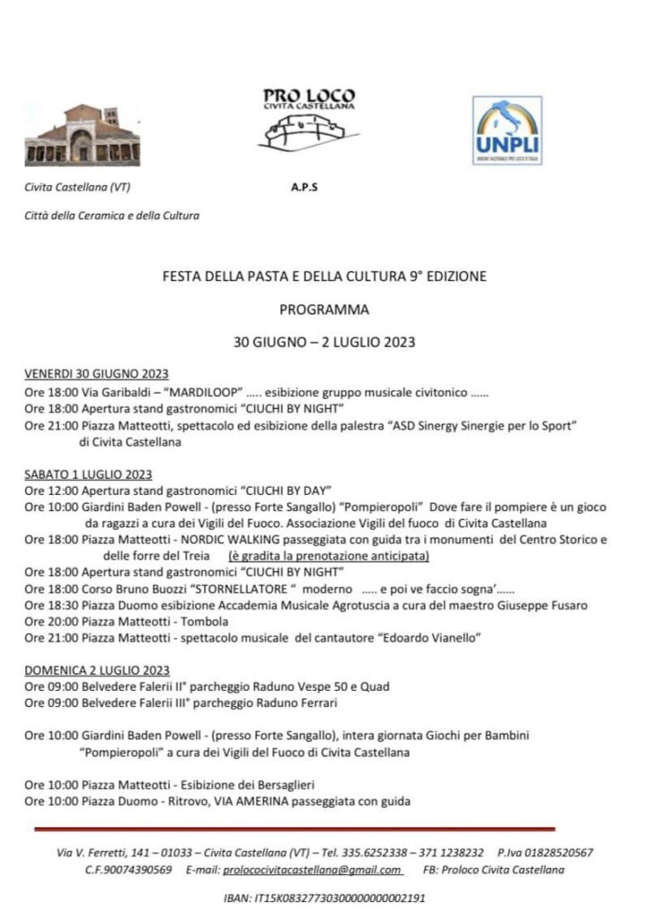 A Civita Castellana (VT) dal 30 giugno al 2 luglio la Festa della Pasta e della Cultura