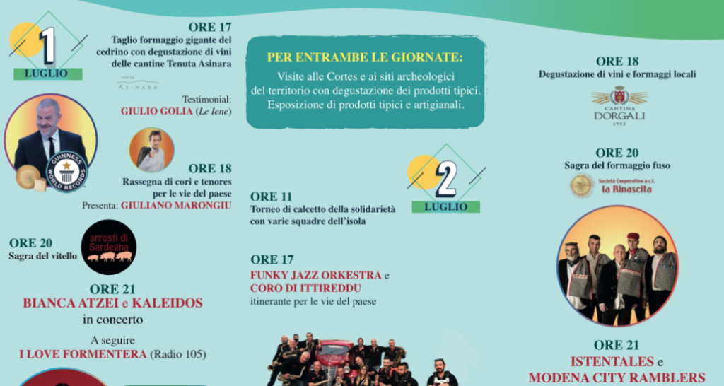 Ad esibirsi sul palco insieme agli Istentales che chiuderanno l’evento il 2 luglio, ci sarà Bianca Atzei e i Kaleidos che invece lo apriranno con un testimonial d’eccezione Giulio Golia delle Iene. A seguire sempre il 1 luglio “I love Formentera di Radio 105. Il 2 luglio Funky Jazz Orchestra e Coro di Ittireddu itinerante per le vie del paese. I Modena City Ramblers chiudono insieme agli Istentales l’evento. Presenta Giuliano Marongiu!