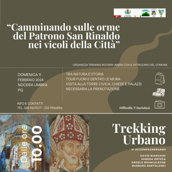 Torna il trekking urbano nel centro storico della Città delle acque. L’iniziativa, “Camminando sulle orme del Patrono San Rinaldo nei vicoli della Città”, promossa dall’associazione Trekking Nocera Umbra con il patrocinio del Comune di Nocera Umbra, si svolgerà domenica 11 febbraio nel weekend dedicato alle celebrazioni del Santo. Si camminerà tra gli antichi vicoli dove il tempo sembra esserci fermato, monumenti e luoghi d’arte. Non mancherà la visita alla Torre dei Trinci, chiamata dai nocerini il Campanaccio, simbolo indiscusso della città e uno dei luoghi top per ammirare i bellissimi panorami che la circondano.
