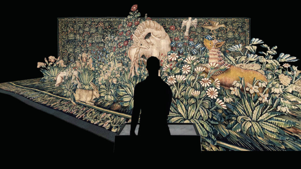 Il giardino incantato propone una grande proiezione immersiva che farà scoprire i segreti della storia e della fabbricazione dell’arazzo e approfondire i soggetti dedicati alla flora e alla fauna da un punto di vista inusuale e innovativo.