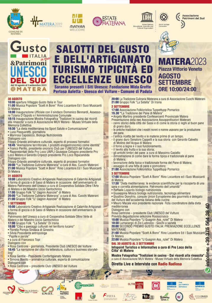 Gusto Italia in tour è attivo tutti i giorni dalle ore 10 a mezzanotte. La diretta live e le interviste saranno curate da Radio Radiosa, presente con una propria postazione in Piazza Vittorio Veneto. Media partner dell’iniziativa il blogzine Rosmarinonews.it.