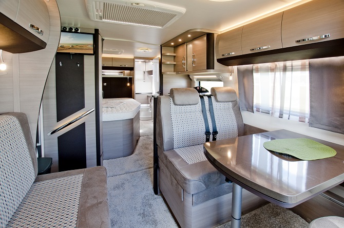 Anche gli interni della gamma Prestige sono stati rivisti e sono due le nuove piantine, entrambe con letto matrimoniale alla francese e bagno posteriore trasversale la 560 WFU e la 660 WFC, che in particolare propone nella parte anteriore una dinette a C, nuova porta di entrata, profili della cucina rinnovati e un confortevole e pratico armadio riscaldato presso l’ingresso.