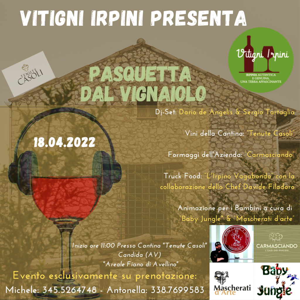 Come trascorrere una Pasquetta alternativa, divertente con al centro il vino e il cibo irpino? La risposta ve la dà Vitigni Irpini che propone l’evento “Pasquetta dal Vignaiolo” che si svolgerà Lunedì 18 Aprile 2022 presso la cantina del palazzo storico di “Tenute Casoli” nel borgo di Candida, in provincia di Avellino, nell’areale del Fiano di Avellino.