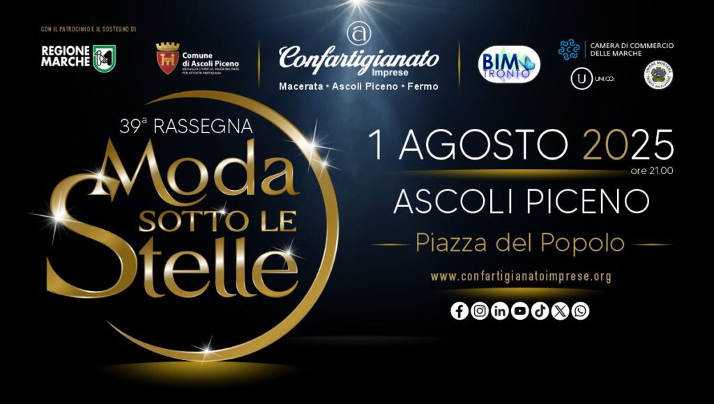 L’eleganza senza tempo di Piazza del Popolo, ad Ascoli Piceno, torna ad ospitare l’evento che celebra la bellezza in tutte le sue forme. Venerdì 1° agosto 2025, dalle ore 21, la Città delle Cento Torri sarà palco della 39ª edizione della Rassegna di Moda sotto le Stelle, passerella che mette in risalto la straordinaria qualità delle imprese artigiane marchigiane.