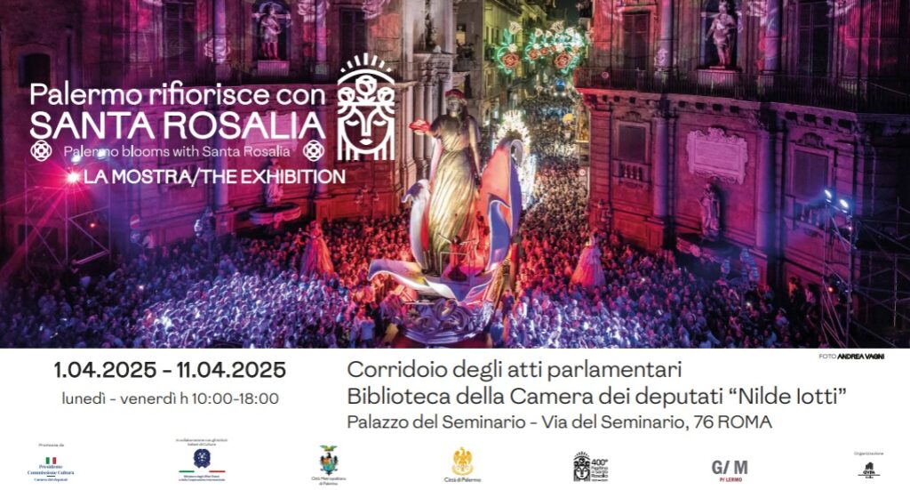 Con l’inaugurazione del 1 aprile a Roma all’interno della biblioteca della Camera dei Deputati Nilde Iotti nel Palazzo del Seminario inizia il tour internazionale della mostra Palermo rifiorisce con Santa Rosalia. Promossa dal Presidente della Commissione Cultura della Camera dei deputati, per una iniziativa del Comune di Palermo, con il sostegno della Città Metropolitana, l’esposizione delle 27 fotografie selezionate in occasione del concorso fotografico bandito dal Comune nell’ambito del Festino di Santa Rosalia del 14 luglio 2024.