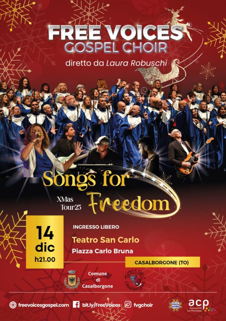 Il 14 dicembre, alle 21, nell’ambito del cartellone di appuntamenti “Off” realizzati con il patrocinio del Comune, il Teatro San Carlo di piazza Carlo Bruna a Casalborgone (To) ospiterà una tappa del “XMasTour 2025” del Free Voices Gospel Choir®, diretto da Laura Robuschi, per l’Associazione Voci Libere di Beinasco, che propone un fitto calendario di concerti sulle note del gospel, all’insegna della solidarietà. Un messaggio condiviso di libertà, luce e bisogno di pace con un gran finale, il 30 dicembre 2025, nello spettacolare Christmas Gospel Show che si terrà alle Fonderie Limone (Moncalieri).