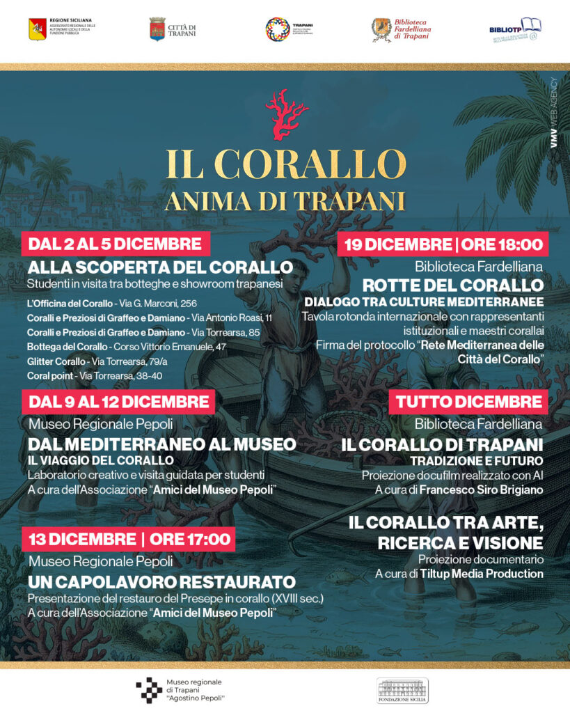 Il percorso prosegue dal 9 al 12 dicembre al Museo Regionale Pepoli con il laboratorio creativo “Dal Mediterraneo al Museo – Il viaggio del corallo”, curato dall’Associazione “Amici del Museo Pepoli”.