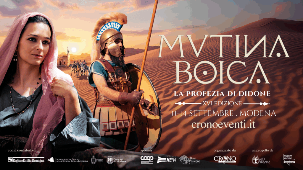 Mutina Boica 2025 guarda ancora una volta all’evento fondativo della storia cittadina, ovvero alla seconda guerra punica (218-202 a.C.) che portò per la prima volta il nome di Mutina a comparire nelle pagine della storia. E’ infatti seguendo le vicende di Annibale, il grande generale cartaginese che invase l’Italia alla fine del III secolo dando inizio al più grande conflitto dell’antichità, che compare il nome di Mutina. Il titolo dell’edizione 2025 “La profezia di Didone” richiama le origini mitologiche di quel conflitto: la regina Didone, fondatrice di Cartagine, poco prima di togliersi la vita in seguito all’abbandono dell’esule troiano Enea – in rotta verso l’Italia e la successiva fondazione di Roma – predisse che la sua morte avrebbe perseguitato lo stesso Enea e i suoi discendenti, dando così origine alla secolare inimicizia che portò Roma e Cartagine ad affrontarsi per due secoli, fino alla definitiva distruzione di Cartagine. Nel 2025 Mutina Boica guarderà a quei fatti disegnando i confini, le ragioni (vere o pretestuose) di uno scontro tra nord e sud del mondo, oriente e occidente, i cui echi risuonano tristemente nelle pagine del nostro mondo attuale.