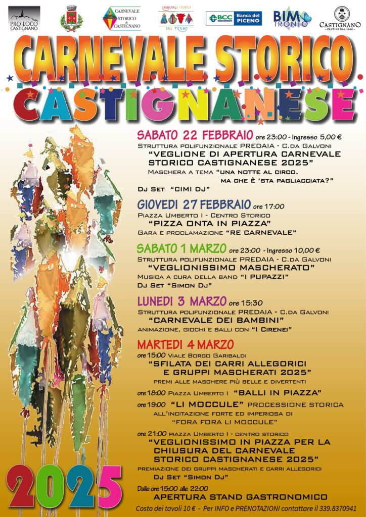 La Pro Loco, con il Presidente Eros Iacoponi e il Consiglio Direttivo, ha svelato l’edizione 2025 del Carnevale Storico Castignanese, la tradizione locale così sentita e partecipata, che si tramanda di generazione in generazione da secoli, come rivelano alcuni antichi documenti da Archivio Comunale, verificati anche dal parroco archivista Don Vincenzo Catani, in cui vi sono espliciti riferimenti a festeggiamenti carnascialeschi a Castignano, con relative disposizioni delle autorità, almeno sin dal 1615. E senza dimenticare, soprattutto, quei Moccoli, diretti discendenti e prosecutori dei moccoletti romani, evento finale che nella Capitale e in gran parte dello Stato Pontificio chiudeva i festeggiamenti carnascialeschi almeno dal XVIII secolo. Loro, i Moccoli, fiore all’occhiello e caratteristica univoca del Carnevale di Castignano, e simbolo indiscutibile della sua storicità, che anche il castignanese Prof. Fioravanti Andrea ha iniziato ad investigare in una lunga e minuziosa ricerca, pubblicando la scorsa estate il primo libro sul Carnevale Castignanese (“Il fuoco e la cenere” – I moccoli e la storia del carnevale da Roma a Castignano).