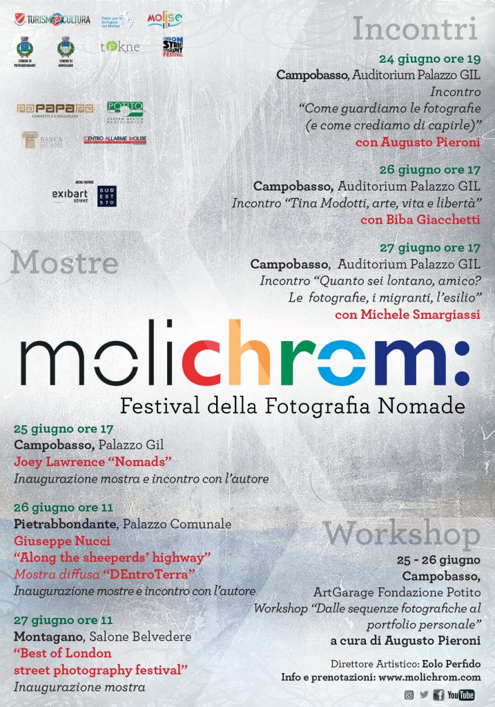 “Ho voluto portare l’attenzione su degli artisti che attraverso esperienze molto diverse e punti di vista anche molto distanti, offrono un’opportunità unica di fare esperienza di quello che possiamo chiamare lo sguardo nomade”. Così il direttore artistico Eolo Perfido introduce la prima edizione di Molichrom: Festival un evento di fotografia internazionale e contemporanea che vede il Molise come centro operativo e il nomadismo come tema centrale di questa edizione. “Terra di “tratturi” e “transumanza”, il Molise ha da sempre un forte legame con il suo territorio e la sua storia. Anche per questo motivo – continua il direttore – il tema scelto per la prima edizione è quello del Nomadismo, come spunto concettuale per raccontare attraverso la fotografia quella che è una delle identità più importanti del genere umano.” Da giovedì 24 giugno le mostre in esclusiva di giganti della fotografia come Joey Lawrence e Giuseppe Nucci, la prestigiosa selezione della Best Of London Street Photography Festival, gli incontri con Michele Smargiassi, Biba Giacchetti e Augusto Pieroni, guerrilla art e workshop diffusi tra Campobasso, Montagano e Pietrabbondante.