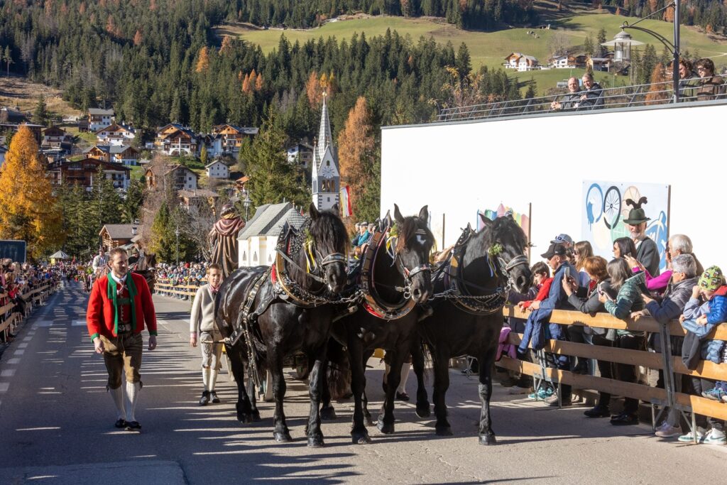 L’evento ha inizio, come da tradizione, con la S. Messa solenne delle ore 9.30, celebrata nella chiesa parrocchiale di San Leonardo, consacrata ai Santi Leonardo e Giacomo. Alle 10.45 si prosegue con la sfilata, che parte dalla zona artigianale del paese e si districa lungo il centro. A sfilare sul percorso ci saranno i cavalli Haflinger – per i quali è stato avviato il processo di riconoscimento come bene immateriale UNESCO – e i cavalli norici, che un anno fa hanno celebrato i 120 anni dell’associazione Val Badia. Il corteo sarà condotto dal carro del Santo patrono, seguito da un consistente numero di cavalli, dai costumi tradizionali delle valli ladine e da tutto l’Alto Adige con oltre 700 persone in sfilata e da numerosi carri, addobbati a festa. Tra questi, il carro dedicato ai 25 anni della manifestazione, costruito da alcuni artigiani del posto, come anche il carro con i prodotti derivanti dal raccolto, che verranno venduti alla fine del corteo, il cui ricavato andrà devoluto in beneficenza. Grazie alla grande partecipazione di cavalli e allevatori, provenienti da varie valli e alle quattro bande musicali, il pubblico potrà ammirare una varietà di colori e di costumi tradizionali, vista solamente in poche altre occasioni in Alto Adige.