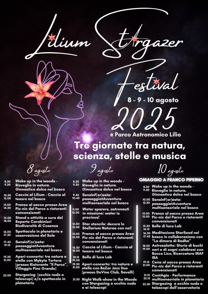 Nel cuore del Parco Astronomico dedicato a Luigi Lilio – il geniale astronomo e matematico calabrese che ha rivoluzionato il tempo con il calendario gregoriano – prende vita un evento di tre giornate, 8-9-10 agosto 2025, per celebrare la bellezza del cielo e della terra: Lilium Stargazer Festival che prende il suo nome da un fiore straordinario, il giglio stargazer (Lilium Orientalis Stargazer), che guarda il cielo proprio come faceva Lilio e che si presenta punteggiato come un cielo stellato.