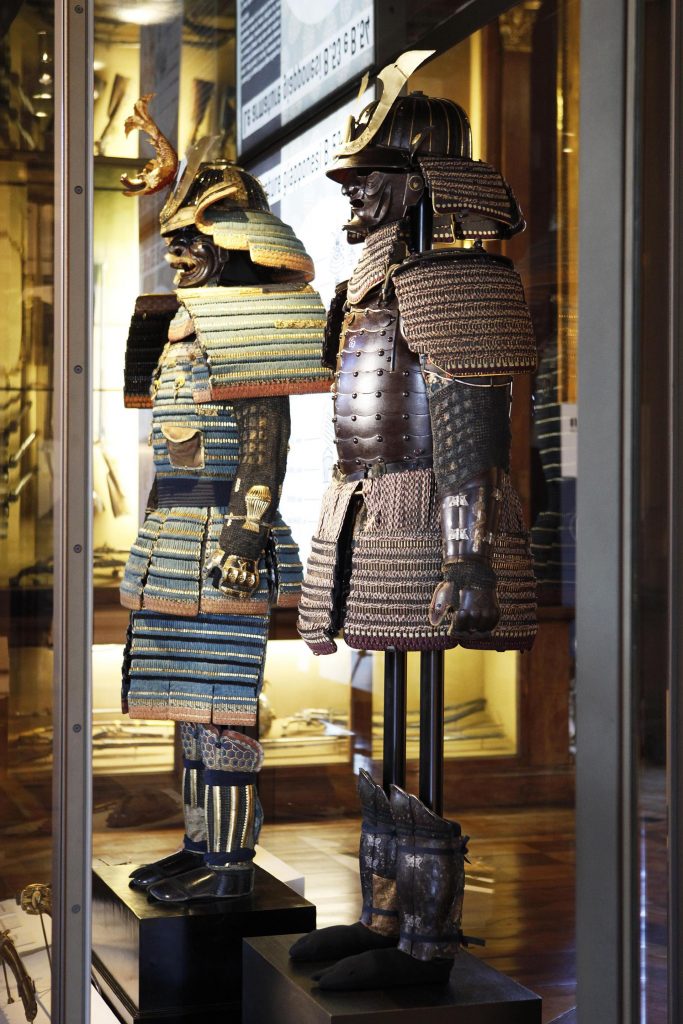 L’allestimento include anche due armature giapponesi, la B. 53 e la B. 54, entrambe donate al sovrano dall’imperatore Meiji nel 1869 e nel 1871, a pochi anni di distanza dalla firma del trattato di amicizia e commercio che apriva le relazioni diplomatiche tra il Regno d’Italia e l’Impero giapponese. Si trattava di doni prestigiosi come testimoniano la cura nel realizzarle e la scelta dei materiali impiegati che indicano la destinazione a personaggi di rango elevato. La prima armatura è un apparato difensivo leggero utilizzato per lo scontro a piedi. A differenza della B. 53, montata già nell’Ottocento su un manichino, l’armatura B. 54 è stata riproposta nel suo insieme solamente ora, per sottolinearne l’aspetto unitario e facilitarne una più immediata lettura. Le due armature, con le collezioni extraeuropee, vennero allestite nella Rotonda dell’Armeria Reale, sala in cui furono sistemate anche le raccolte di Vittorio Emanuele II.