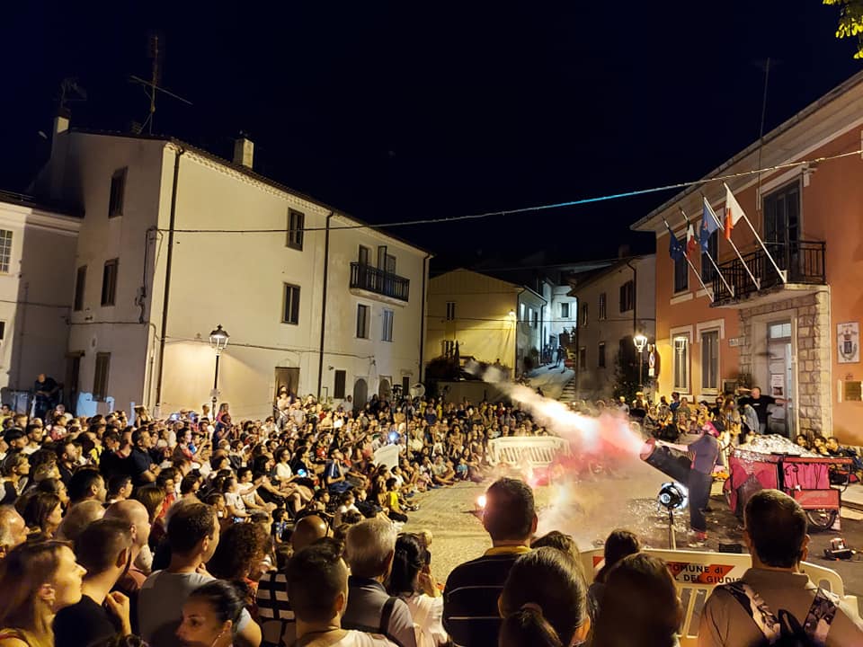 Dalle 17:00, tutti potranno cimentarsi con i giochi di una volta di Cai Mercati, poi alle 18.00 aprirà l’area street food con stand gastronomici espressione del territorio tra hamburger gourmet, arrosticini, piatti al tartufo, panini, crêpes e zucchero filato. Alle 20.00 cominceranno gli spettacoli, portati in scena da eclettici artisti provenienti dal Togo, il Portogallo, il Cile, la Germania, l’Argentina e l’Italia. Si resterà incantati davanti alle acrobazie tra danze e trampoli della compagnia Afuma, e le emozioni saranno a fior di pelle con lo spettacolo dal grande impatto visivo del Piccolo Nuovo Teatro, che riserva sempre nuove sorprese. Ci si divertirà tantissimo con le improvvisazioni del clown, acrobata e attore Daniel Gonçalves, che tra le tante esperienze professionali, è stato protagonista anche del film Dumbo della Disney, per la regia di Tim Burton. E poi Mistral, con il suo palo cinese alto circa 5 metri, coinvolgerà gli spettatori in uno show al limite del possibile. Girovagando per le stradine di Castel del Giudice, lo sguardo sarà catturato dalle fiamme di Creme&Brulè, che uniscono il teatro di figura con l’arte della manipolazione del fuoco con umorismo e numeri talentuosi. Il groove ipnotico della techno e la potenza dei fiati della street band Bandakadabra guideranno gli spettatori tra uno show e l’altro. Mentre gli equilibrismi di Los Filonautas terranno tutti con il fiato sospeso.