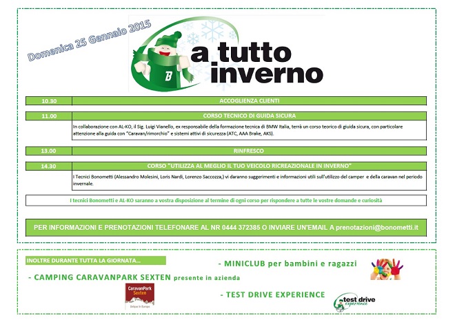 Lo staff di Bonometti Centrocaravan, Al-ko e CaravanPark Sexten vi aspettano Domenica 25 Gennaio per vivere il nuovo evento dell’anno 2015 “A tutto inverno!!!”.