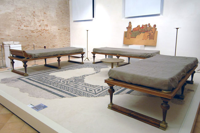 2)     Particolare dell’allestimento con il pavimento del mosaico del triclinio