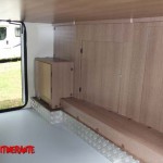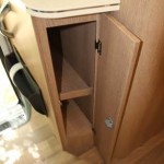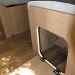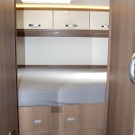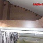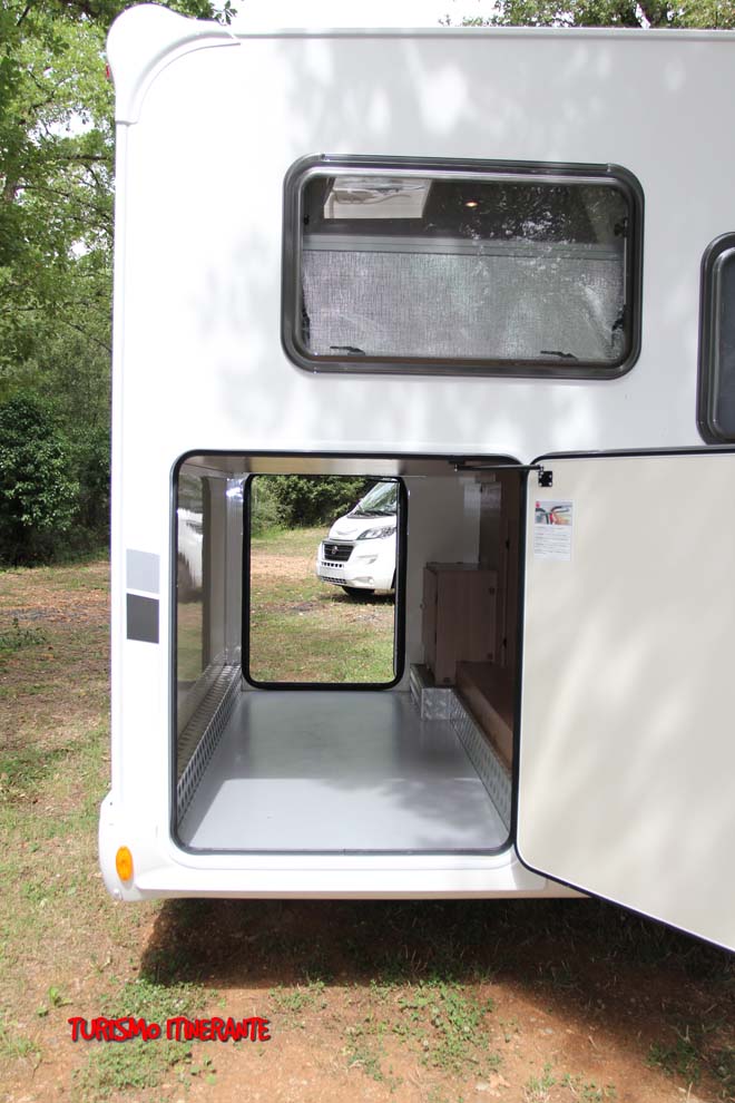 Il letto matrimoniale trasversale rialzato in coda ha permesso ai progettisti McLouis di ricavarne sotto un ampio gavone garage con doppio accesso esterno sia da destra che da sinistra di 1.050 x 900 mm; l’accesso al gavone è possibile anche internamente da un grande sportello sotto il letto stesso.