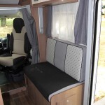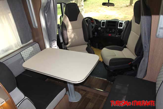 Seminette a L sulla sinistra con secondo divano due posti a destra dell’ingresso che, assieme agli altri due posti dei sedili girevoli nella nuova cabina Fiat, ospitano comodamente 4/5 persone sull’ampio tavolo centrale mono-gamba laccato lucido con cromatura che corre sul bordo.