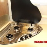 Cucina a “L” con luce a led diffusa anche sotto il piano fornelli/lavabo, frigorifero a colonna e ampi cassettoni di stivaggio.