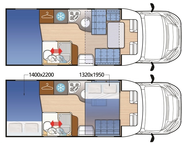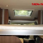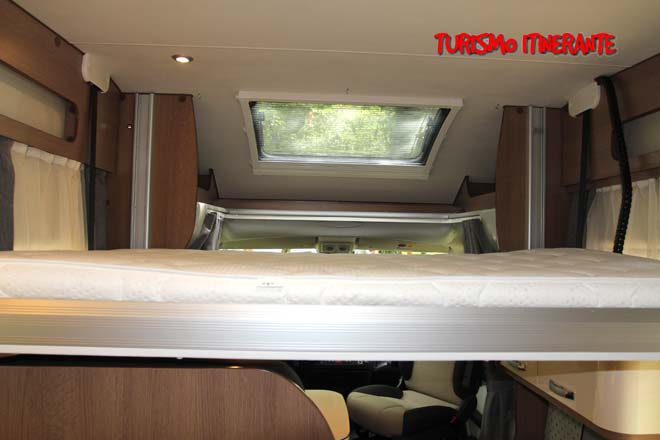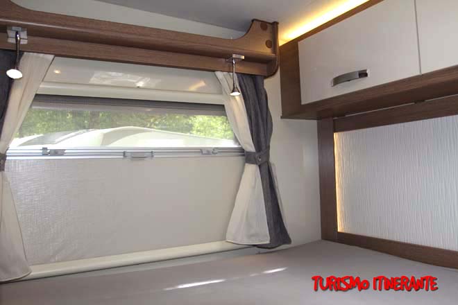 La zona notte posteriore, con il grande letto trasversale di 1.400 x 2.200 mm raggiungibile tramite scaletta, risulta ben arieggiata ed illuminata grazie alle due ampie finestre laterali ed al Midi Heki sul tetto. Zona letto posteriore dove troviamo anche la predisposizione per la TV e dove è presente la nuova testata letto retroilluminata servita da importanti vani di disimpegno.