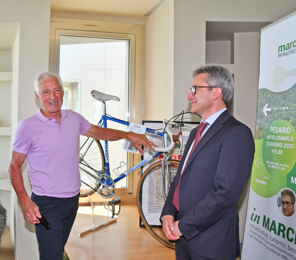 È uno dei passaggi dell’intervento dell’assessore regionale alle Infrastrutture Francesco Baldelli, in occasione del convegno all’Hotel Charlie di Pesaro che si è tenuto nella giornata di oggi e ha visto la partecipazione del campione Francesco Moser. “In Marche Bike: Infrastrutture, Turismo, Benessere e Innovazione”, appuntamento ideato per affrontare i temi della mobilità sostenibile e del cicloturismo, tra gli assi portanti del Piano Infrastrutture Marche 2032.