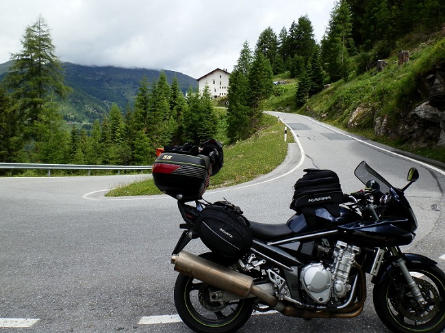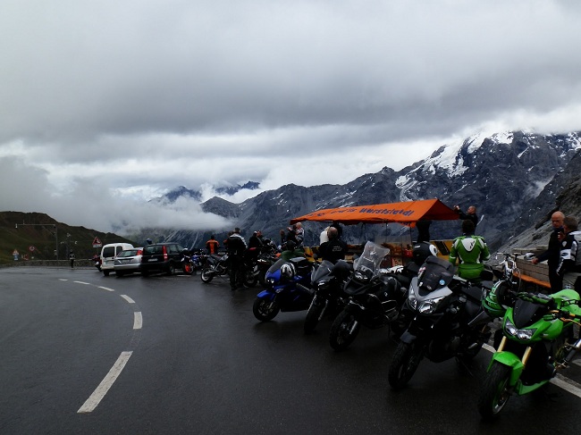 Dopo Zernez giro a sinistra e prendo la Val di Mustair; finalmente smette di piovere e la strada è asciutta, mi fermo allora a fare benza e per cambiare i guanti ormai fradici e riprendo di corsa perchè la pioggia del Fuelapass mi raggiunge. Faccio di corsa l’Ofenpass e finalmente si comincia a vedere qualche macchia di azzurro nel cielo, riprendo un po’ di morale e continuo per Umbrailpass (il SantaMaria per noi) e raggiungo la vetta dello Stelvio.