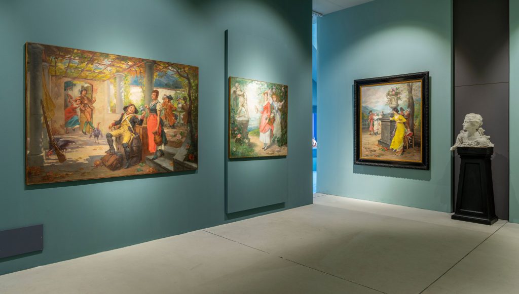 Al centro del secondo pianoc’èla Pinacoteca degli artisti vigezzini, declinata attraverso le tre scuole dell’Ossola, quella di Craveggia, quella di Buttogno e la scuola Rossetti Valentini di Santa Maria Maggiore. Si parte con le grandi pale d’altare di Giuseppe Mattia Borgnis che, nel cuore del Settecento, ha portato il linguaggio pittorico ossolano fino in Inghilterra, e di Lorenzo Peretti senior, raffinato ritrattista della quotidianità. Cuore dell’esposizione sono le opere del patriottico Giuseppe Rossetti, artista grazie al quale ha avuto inizio la collezione di dipinti del Comune di Domodossola. Tra gli altri, suo è l’intrigante quanto affascinante dipinto con i Ritratti dei pittori antichi e moderni, un consesso ideale che vede riuniti intorno a Michelangelo e Raffaello gran parte degli artisti ossolani. Romantica è la sezione dedicata alle opere di Carlo Gaudenzio Lupetti, di Bernardino Peretti, di Antonio Maria Cotti e di Giovanni Baratta, pittori che nel corso dell’Ottocento sviluppano una forte sensibilità che li avvicina ai venti della Belle époque.