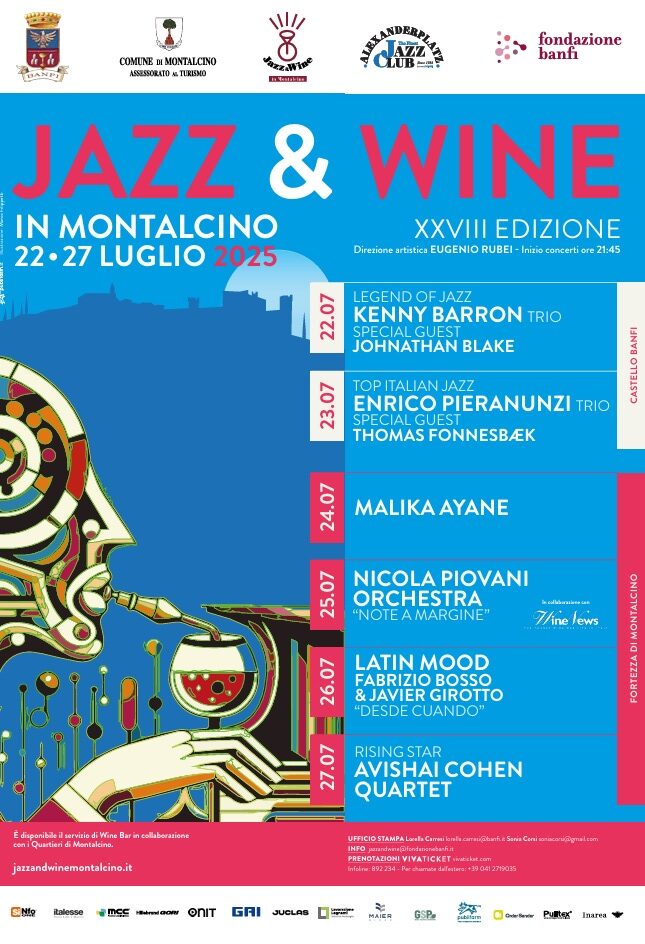 In questi 28 anni, grazie alla sua formula originale, in cui collaborano fianco a fianco una realtà culturale come l’Alexanderplatz e un vero mecenate come Banfi, Jazz & Wine in Montalcino ha attratto sul proprio palcoscenico moltissimi tra i più famosi artisti jazz internazionali ed italiani. Con la direzione artistica di Eugenio Rubei che segue la scia della visione del suo storico direttore artistico, Giampiero Rubei, il festival offre spazio alle proposte più diverse del panorama jazz internazionale, aprendosi a sporadiche incursioni nel pop: un mix di linguaggi che vince e convince consacrando questo cartellone come uno dei più amati di sempre, seguito da un pubblico che – nel tempo – continua a crescere.
