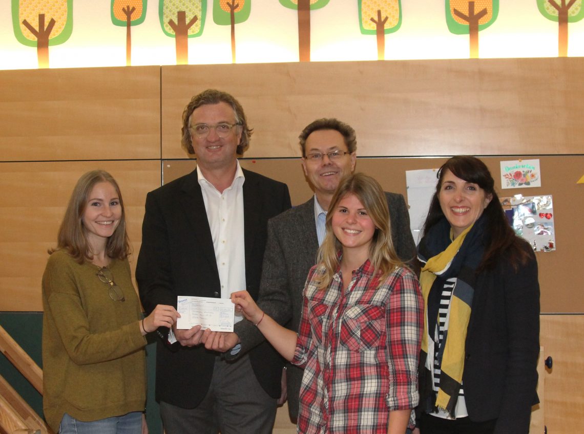 Legenda foto: Il direttore dell’istituto Stephan Dauer e le sue colleghe Larissa Frey e Lucia Gartner ricevono con gioia la donazione che Robert Strauß (secondo da sinistra) e Katrin Baron (a destra) hanno consegnato loro all’inizio del mese di novembre 2017.