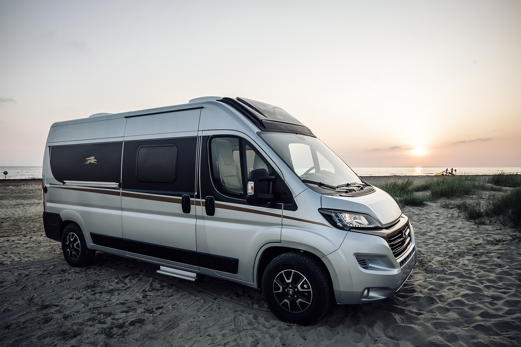 I nuovi Campervan Ecovip sono disponibili in 4 colorazioni esterne: bianco, grigio pastello, grigio alluminio e nero metallizzato. La grafica accattivante, color nero e rame, si abbina perfettamente alle finestre ultrapiatte con cornice in alluminio, dal look automotive. Ben 3 finestre sono dedicate alla zona da letto posteriore (di serie). Inoltre, lo Skyview è disponibile in optional su tutti i modelli, in alternativa al tetto al soffietto con letto matrimoniale.
