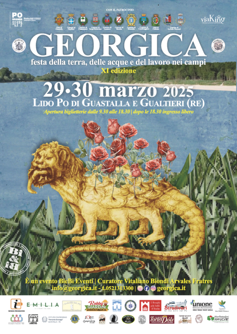 Il 29 e 30 marzo 2025 nel Lido Po di Guastalla e di Gualtieri, a pochi chilometri da Reggio Emilia, si rinnova l’appuntamento con Georgica. Festa della terra, delle acque e del lavoro nei campi (Ingresso 5 euro. Bambini e ragazzi fino ai 14 anni, persone con disabilità ed accompagnatori ingresso libero. Il tema di questa nuova edizione è la responsabilità etica. Georgica infatti invita le persone a riconoscersi come costruttori e assieme manutentori dei territori che abitano.
